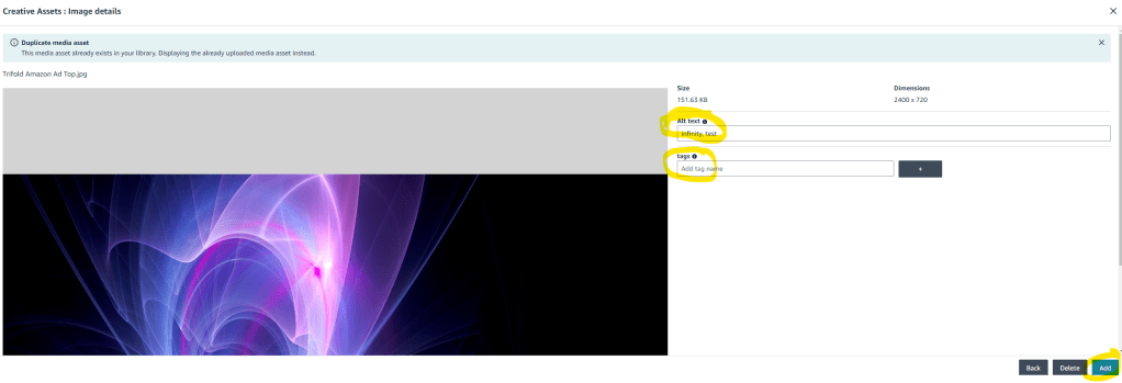 - If you don’t know what Alt Text should contain, hover/click the “?” symbol next to it. Amazon does a good job providing some examples