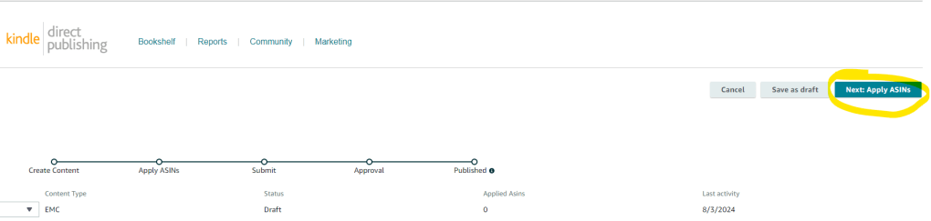 - Enter the book’s ASIN where you wish this content to be placed on. If you don’t know this number, Save as Draft, and navigate back to your KDP bookshelf. You’ll notice that ASINs are listed near each book type