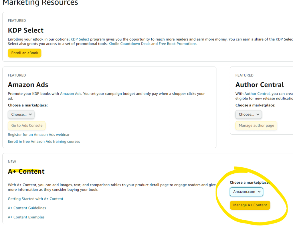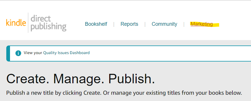 - Note: this marketing page also houses useful tools like Amazon ads, KDP select enrollment, Author Central, and the ability to run a price promotion and/or nominate your eBooks for Kindle Deals/Prime Reading. I highly recommend spending some time here and familiarizing yourself with these options!