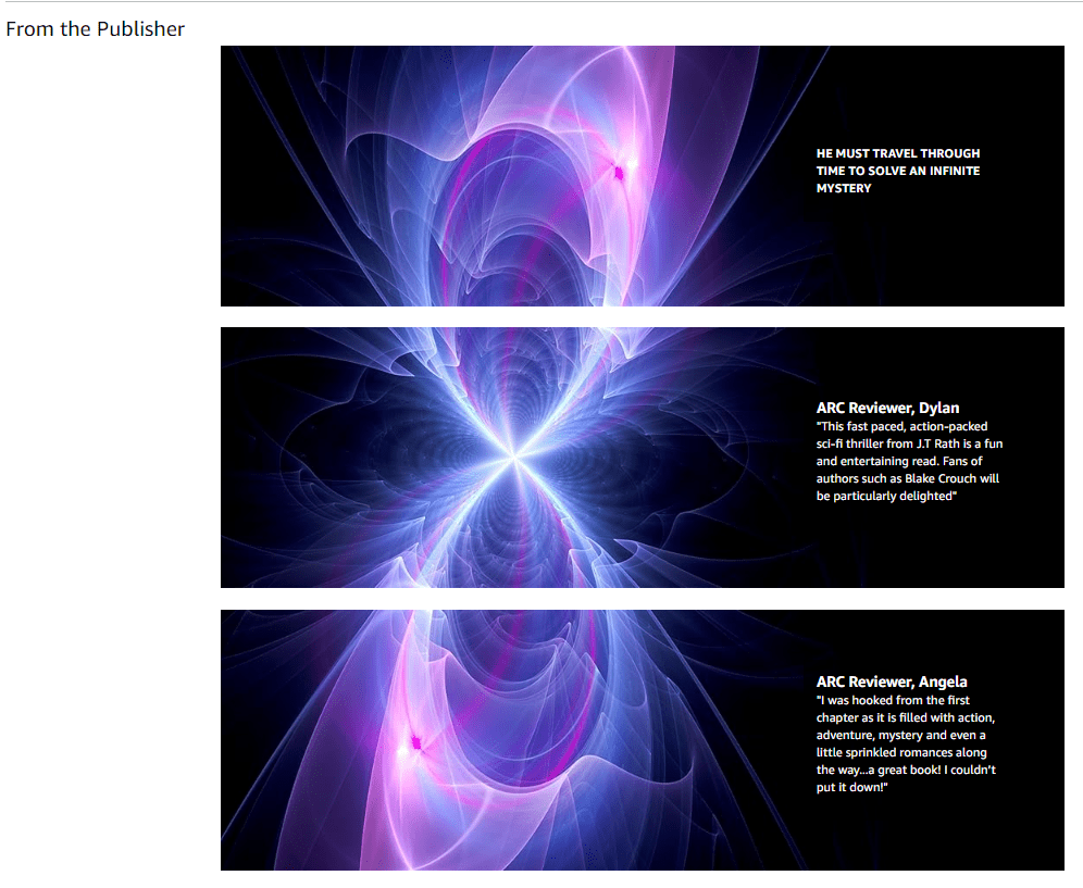 To give you an example of what we’re talking about, let me first show you Infinitude‘s A+ Content, a trifold of sorts, that I created for its release. I’ve found the trifold type is one of the most popular among authors and can be effective if done well, so it’s the type of content we’ll walk through today.