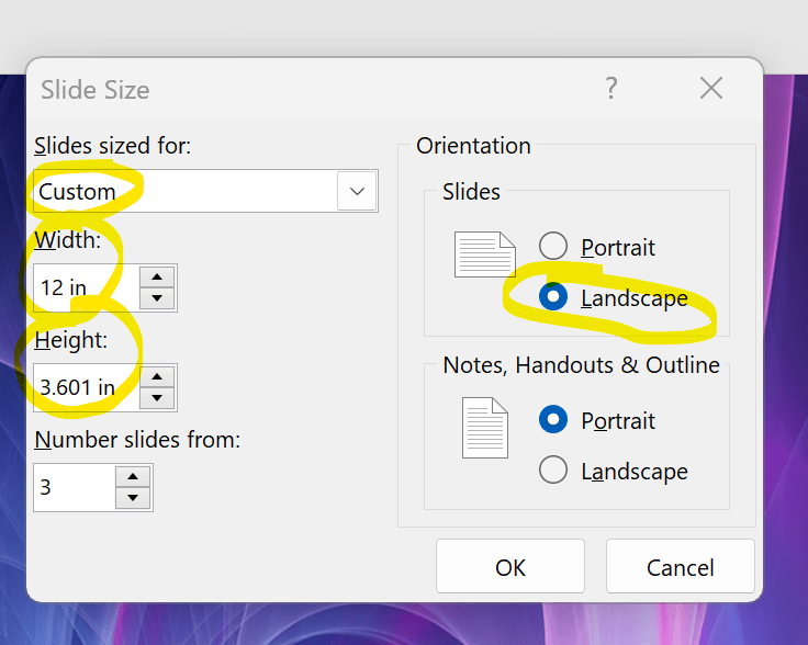 - Type in a custom slide Width and Height. I also changed my orientation to Landscape. You may have to play around with this to get it just right! For mine, I chose the following